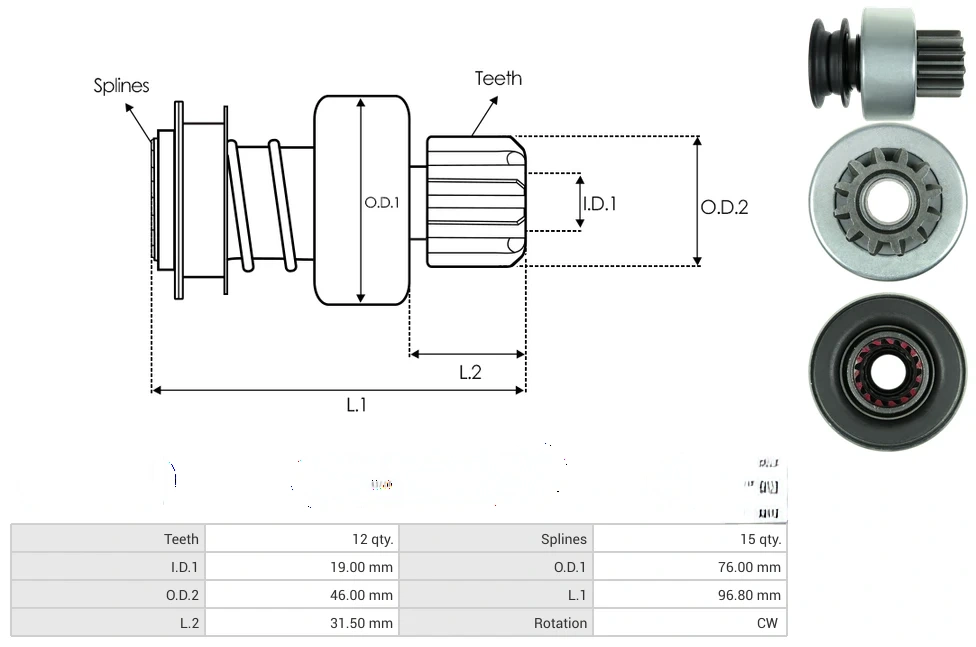 Starter drives Teeth [ qty. ] 12 Splines [ qty. ] 15 I.D.1 [ mm ] 19.00 O.D.1 [ mm ] 76.00 O.D.2 [ mm ] 46.00 L.1 [ mm ] 96.80 L.2 [ mm ] 31.50 Rotation CW