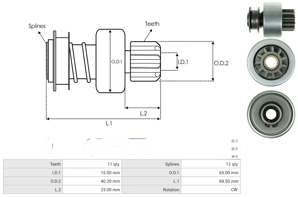 Starter drives Teeth [ qty. ] 11 Splines [ qty. ] 12 I.D.1 [ mm ] 15.00 O.D.1 [ mm ] 65.00 O.D.2 [ mm ] 40.20 L.1 [ mm ] 84.50 L.2 [ mm ] 23.00 Rotation CW