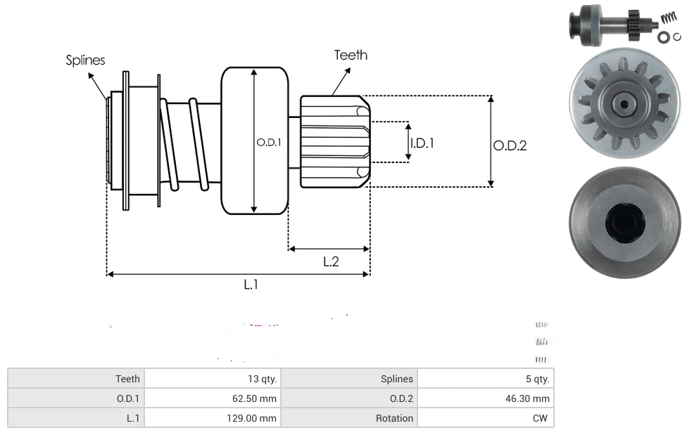 Starter drives Teeth [ qty. ] 13 Splines [ qty. ] 5 O.D.1 [ mm ] 62.50 O.D.2 [ mm ] 46.30 L.1 [ mm ] 129.00 Rotation CW
