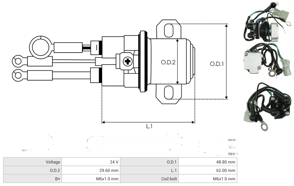 Starter safety switches Voltage [ V ] 24 O.D.1 [ mm ] 48.80 O.D.2 [ mm ] 29.60 L.1 [ mm ] 62.00 B+ [ mm ] M6x1.0 Coil bolt [ mm ] M6x1.0